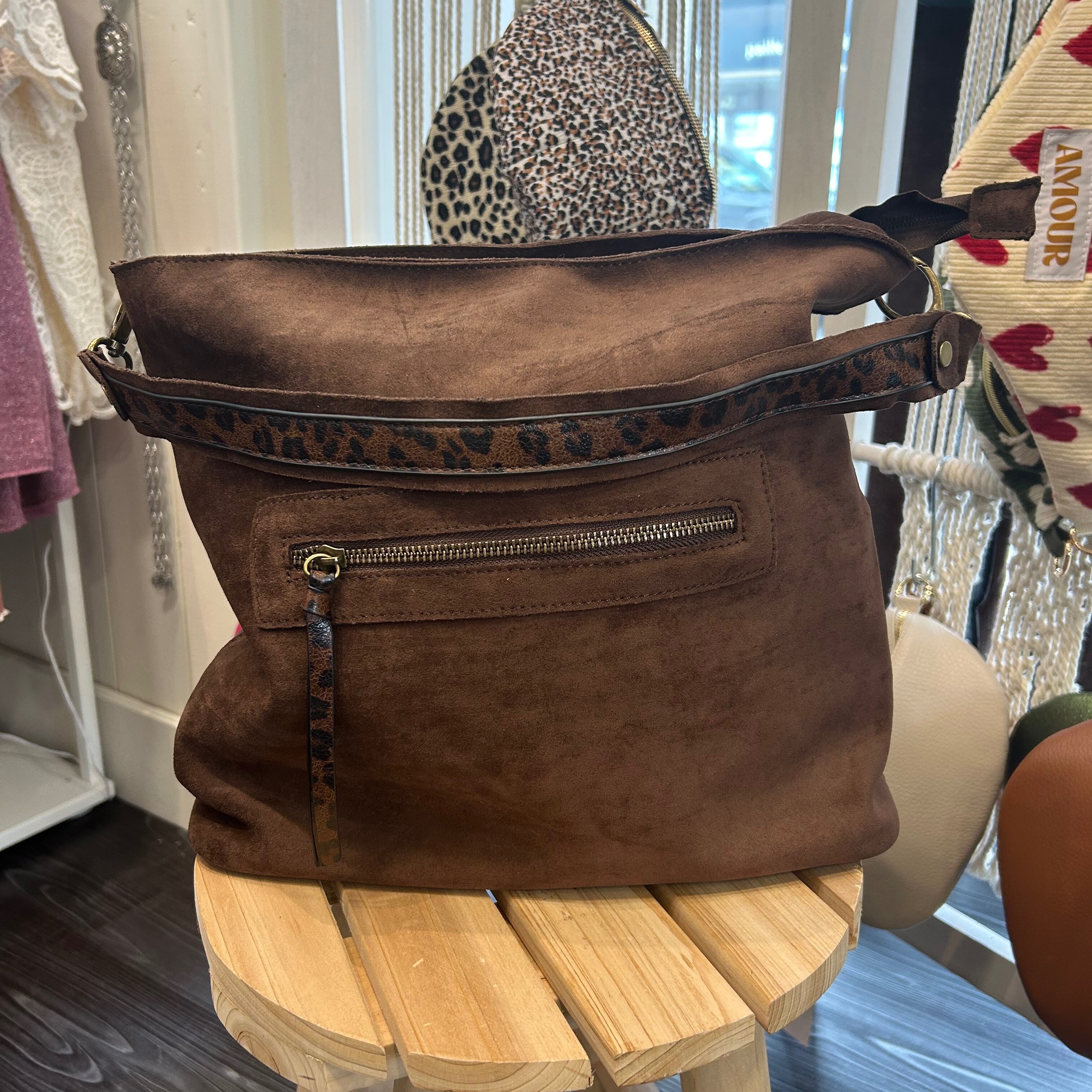 Sac à main marron foncé avec détails léopard