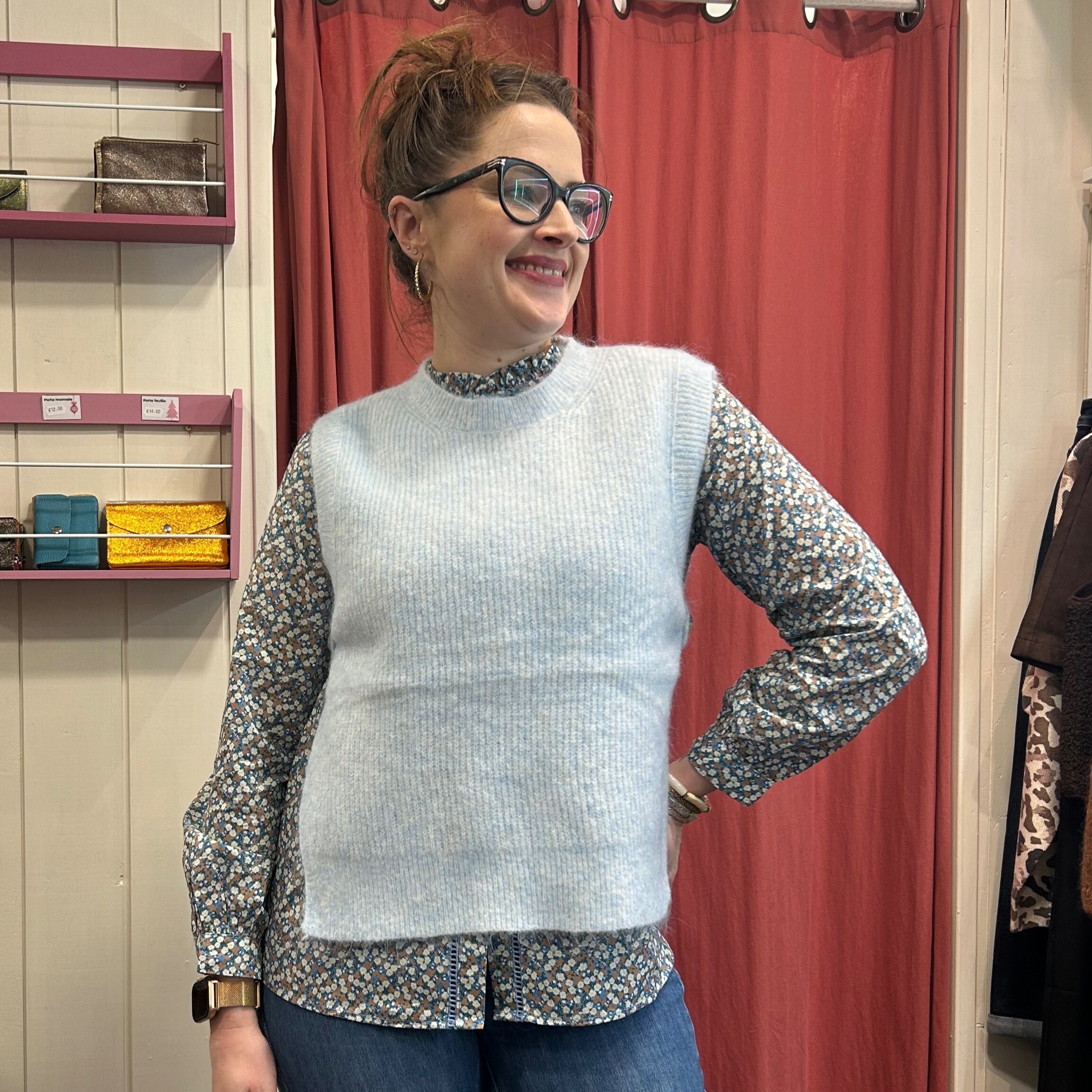 Un vrai indispensable de la saison 💙 . Ce gilet sans manches séduit par sa maille ultra douce et sa couleur bleu ciel délicate. Il apporte immédiatement une touche cosy et tendance à vos looks, tout en restant facile à porter au quotidien.