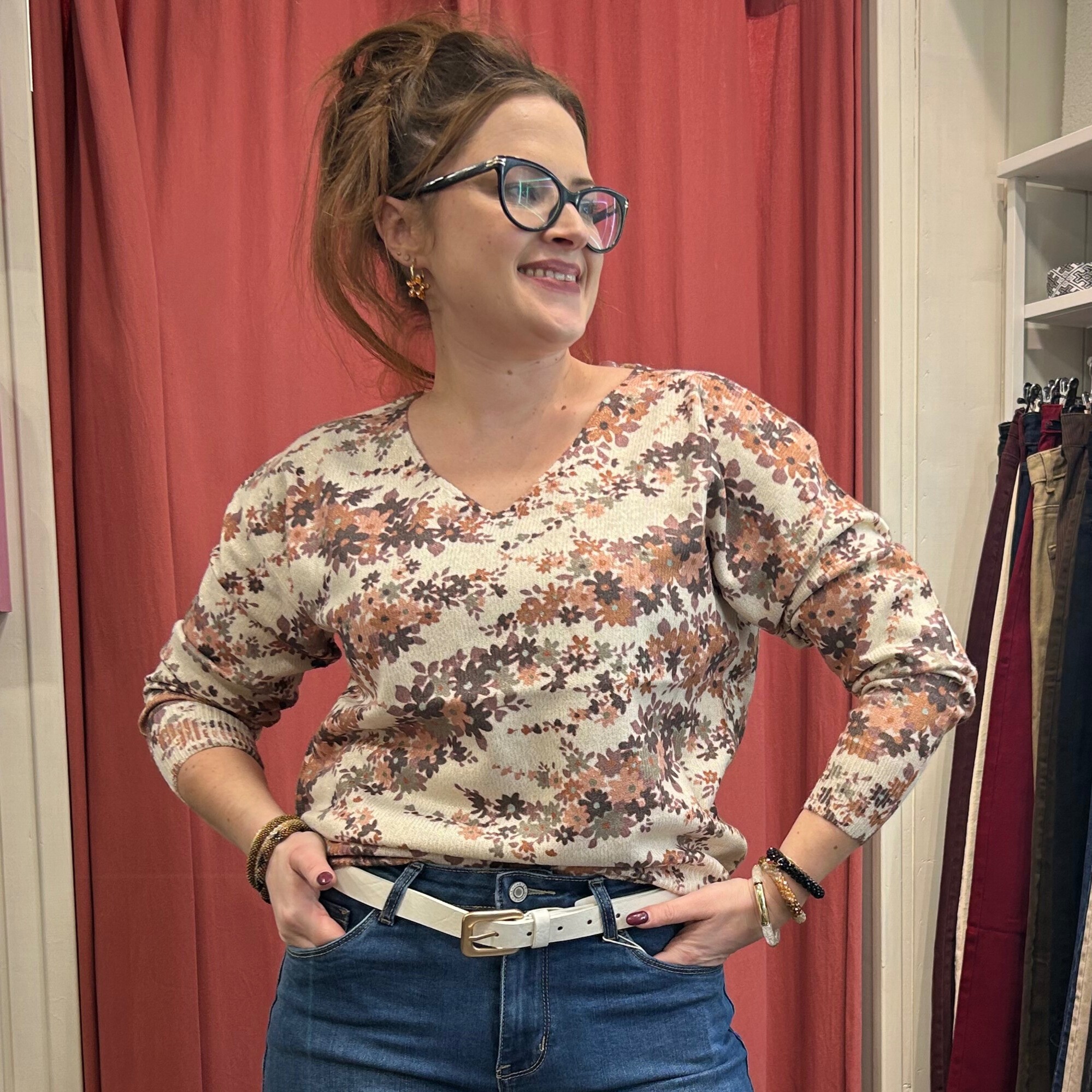 Pull irisé GT avec fleurs kaki / chocolat / beige