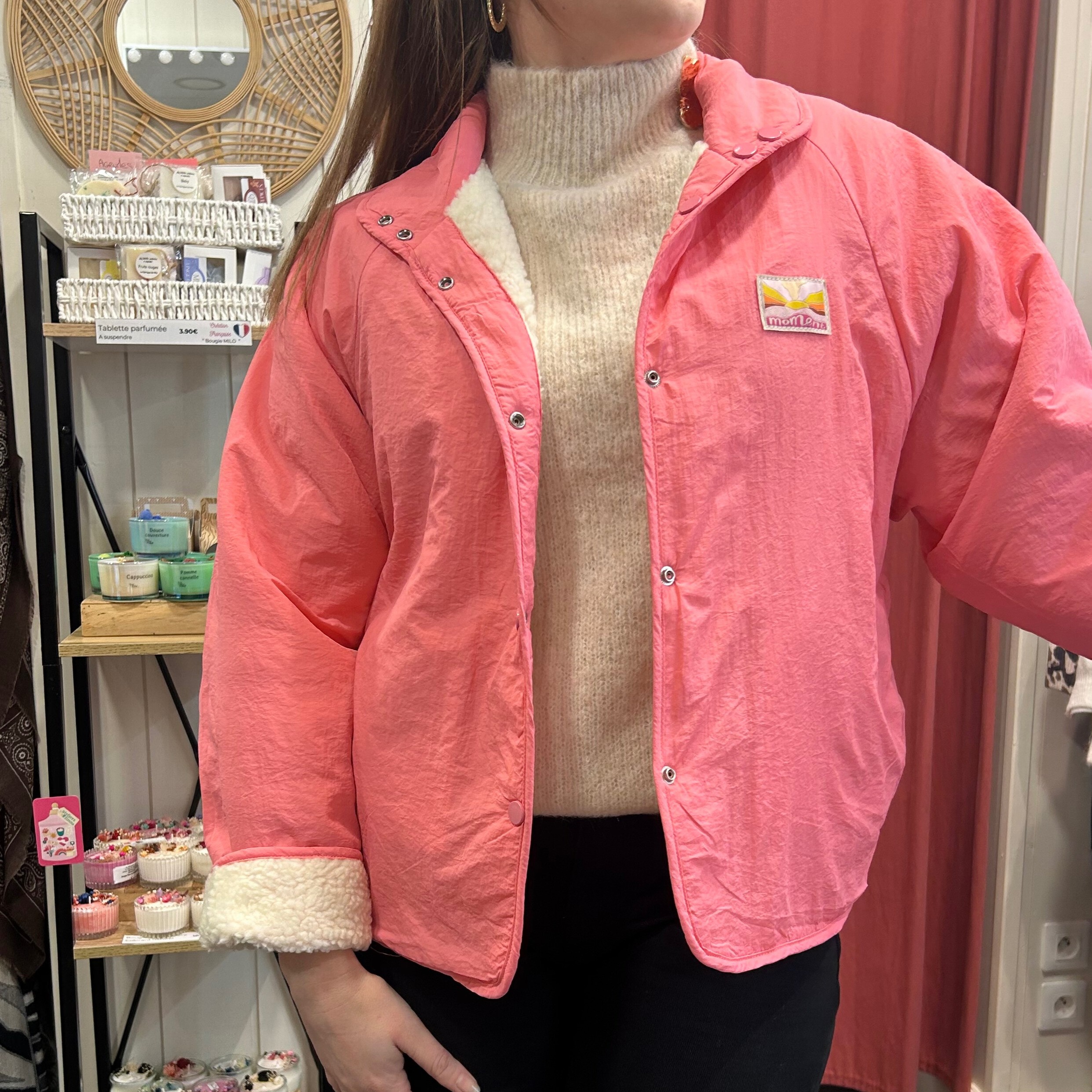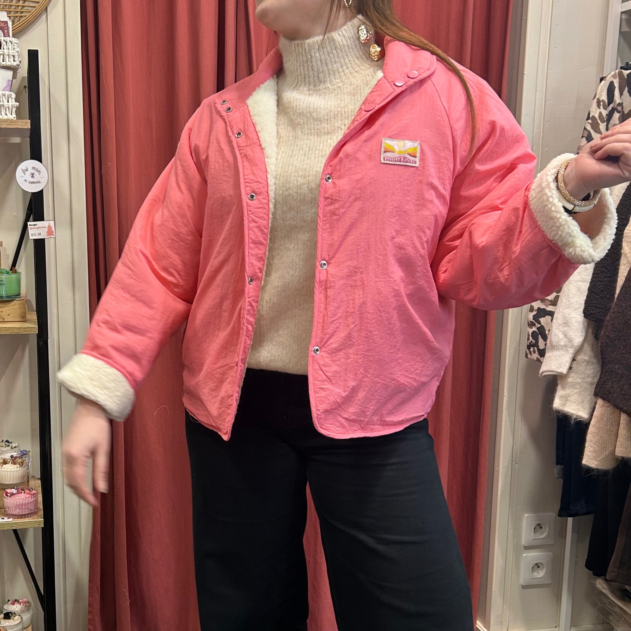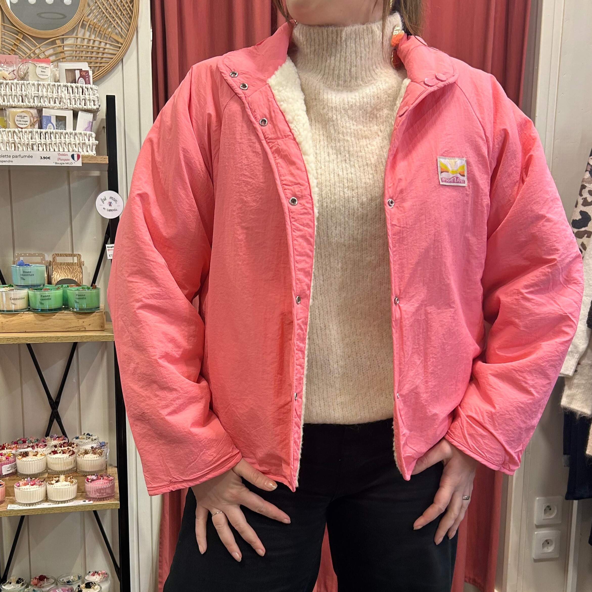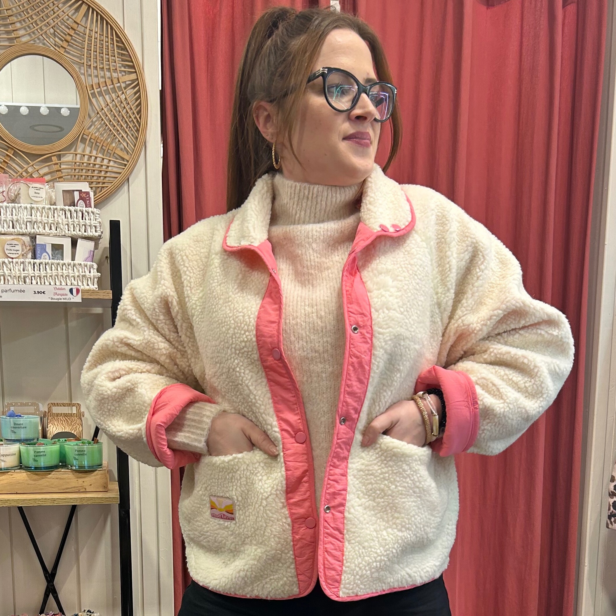 Côté sherpa écru : parfaite sur un pull écru ou beige pour un look doux et cocoon, Côté rose : idéale pour réveiller une tenue simple (jean noir, écru ou brut). À porter ouverte ou fermée selon la silhouette.