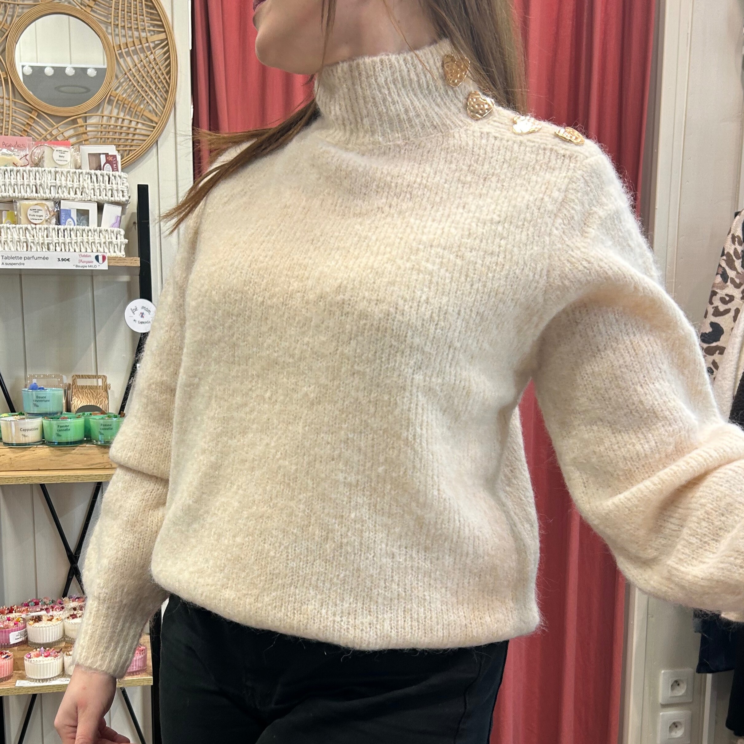 ✨ Pull col montant beige à boutons dorés ✨