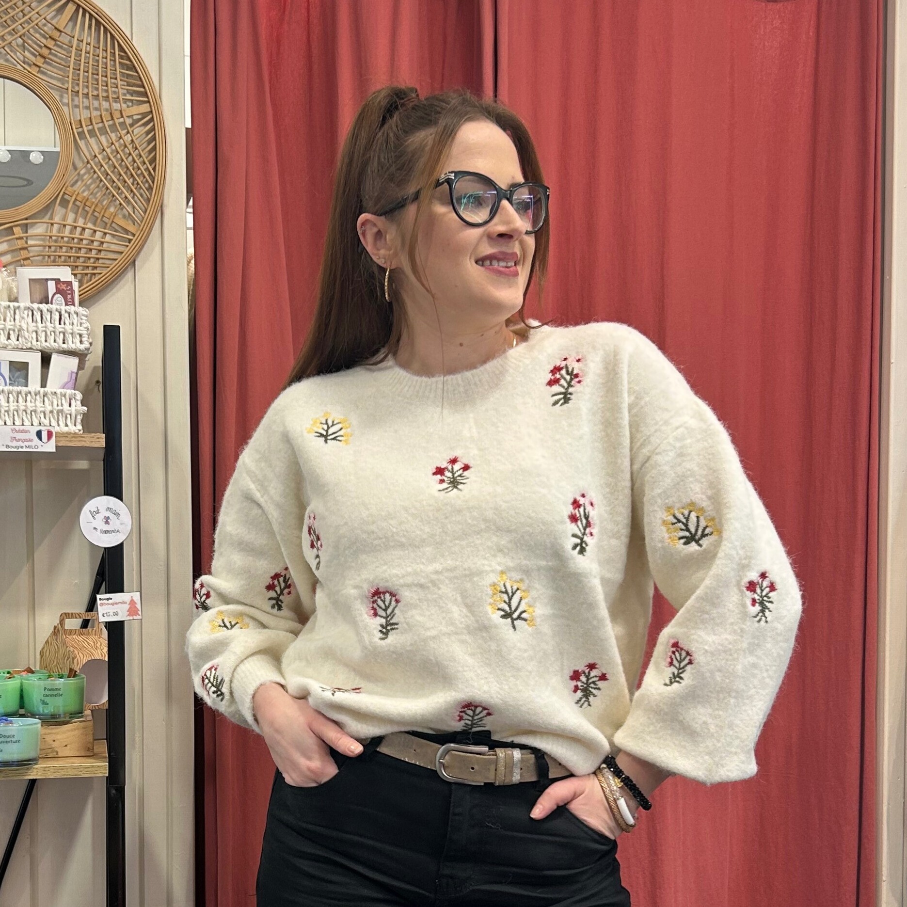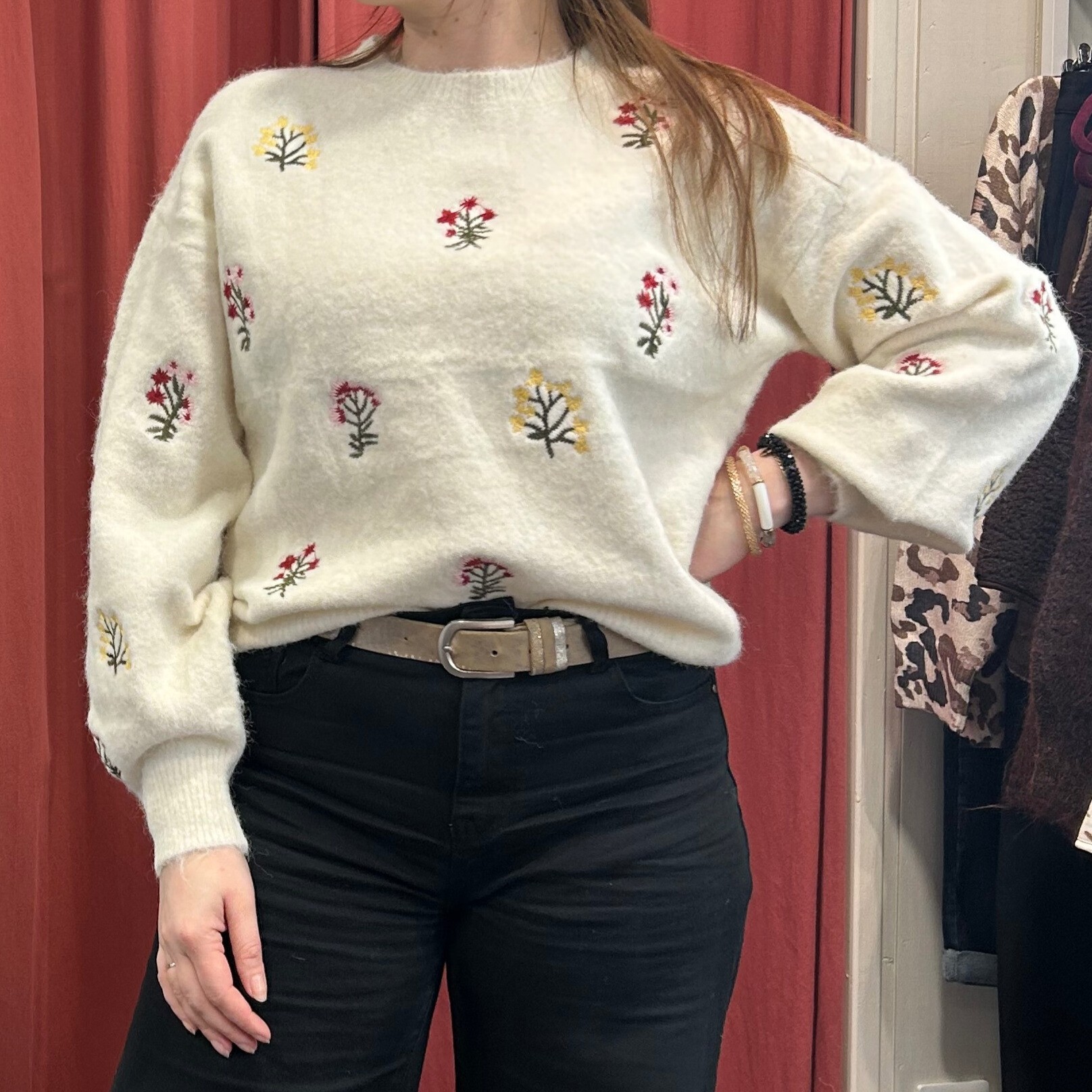 ✨ Pull écru brodé fleurs rouges ✨