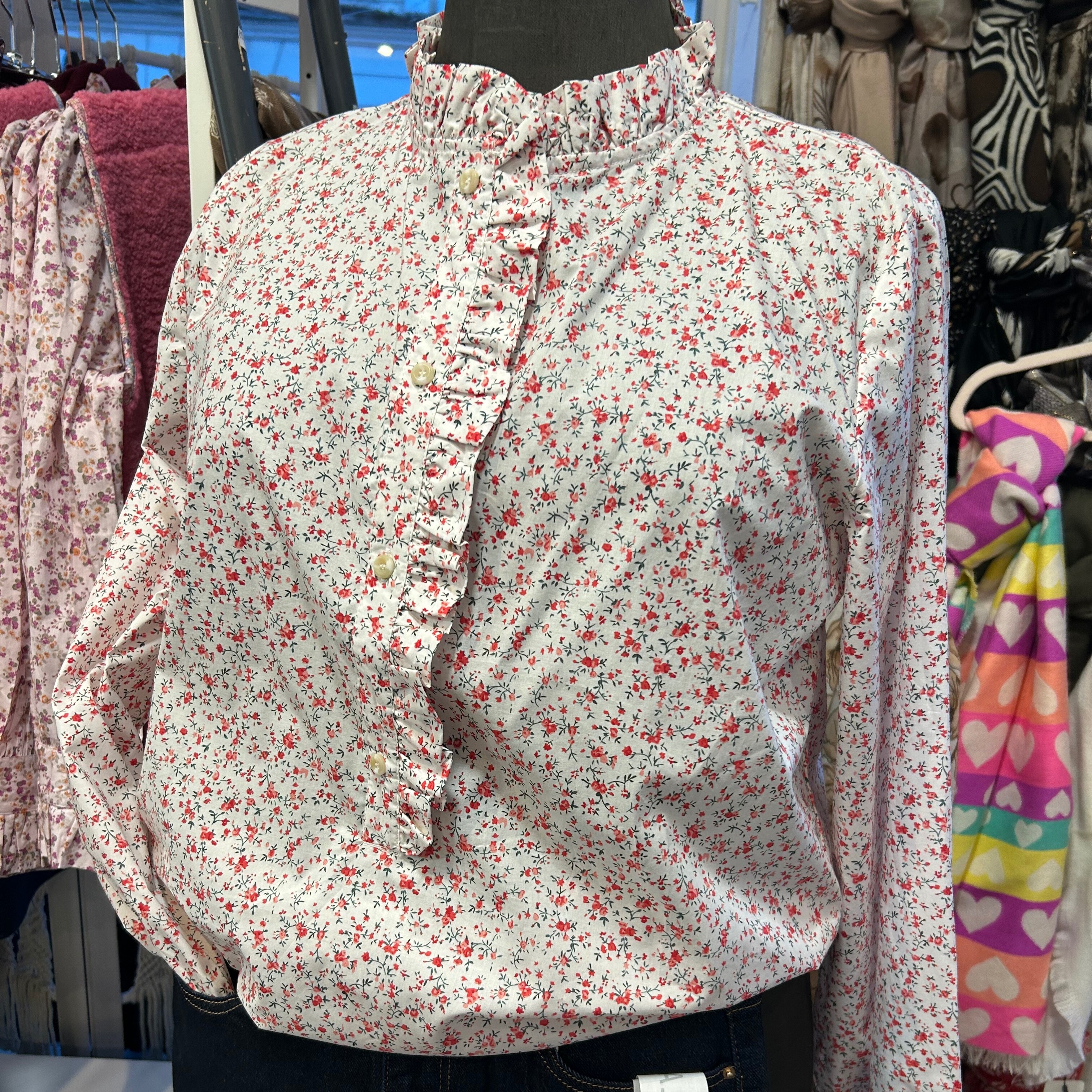 Son imprimé fleuri délicat, son col froncé volanté et son volant vertical sur le devant apportent une touche romantique sans en faire trop.