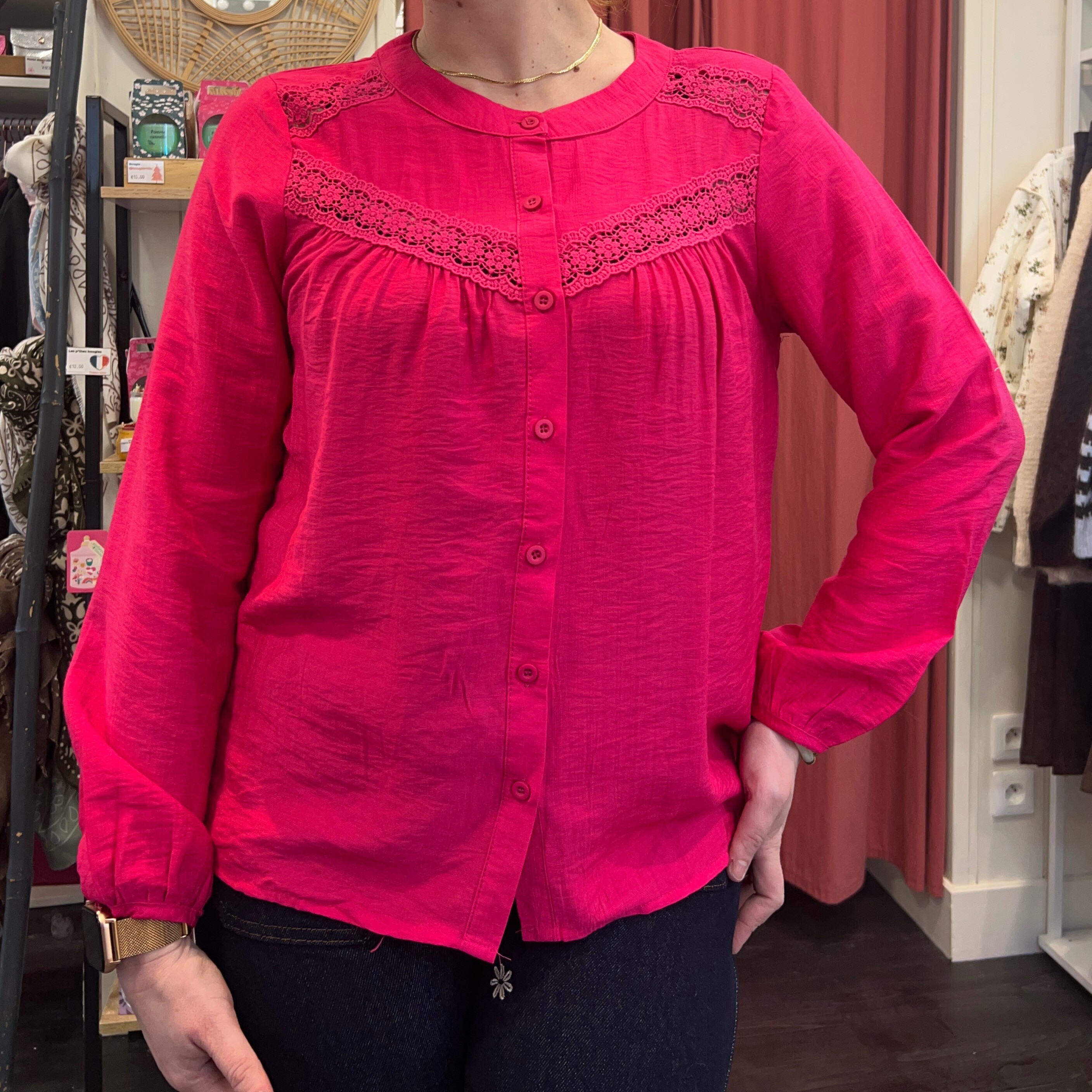 Blouse fuchsia à détails dentelle – Élégance lumineuse