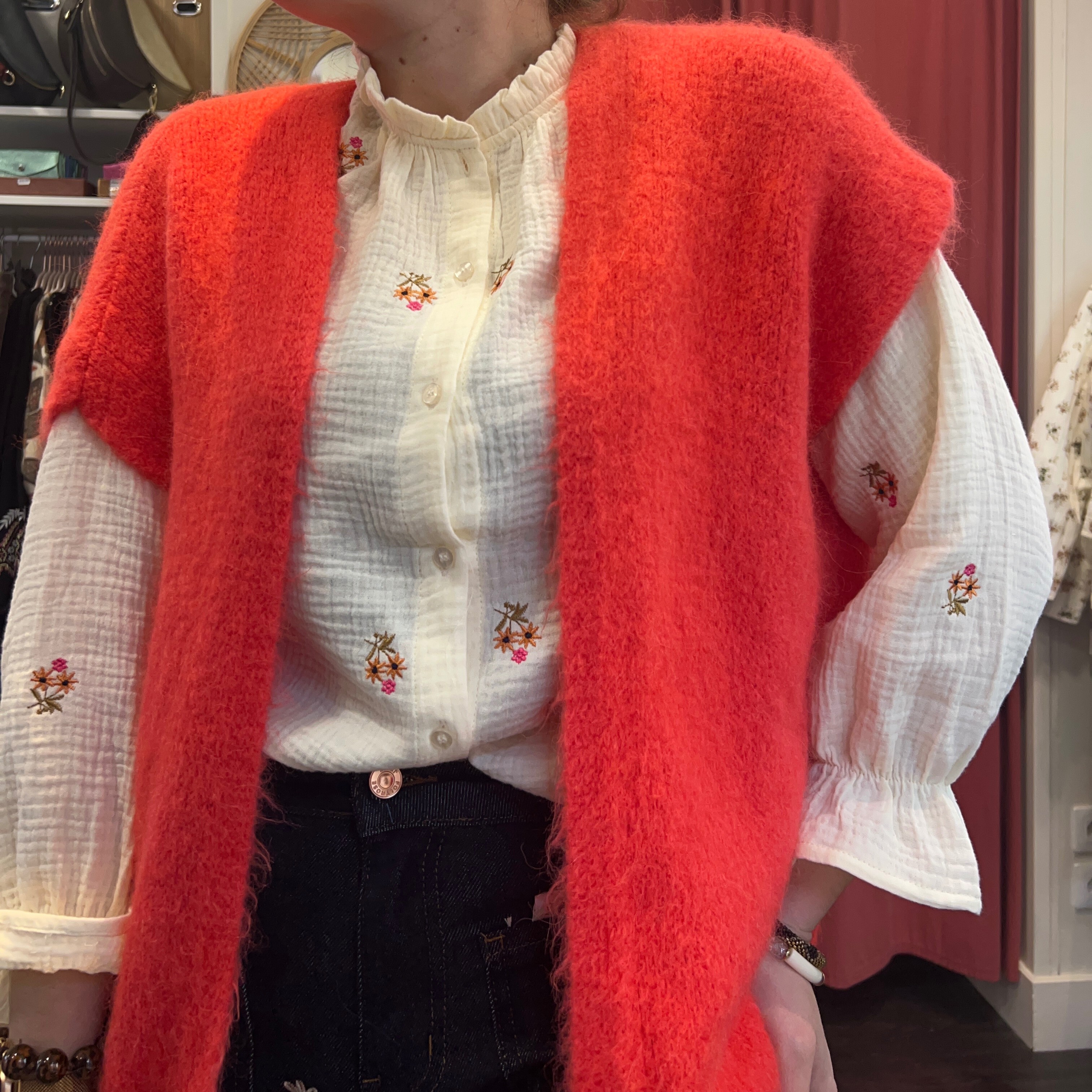 Avec sa maille toute douce et son effet légèrement duveteux, il donne immédiatement du caractère à une blouse, une chemise ou même un simple tee-shirt. Sa coupe fluide et ouverte allonge la silhouette tout en restant confortable et facile à porter au quotidien.