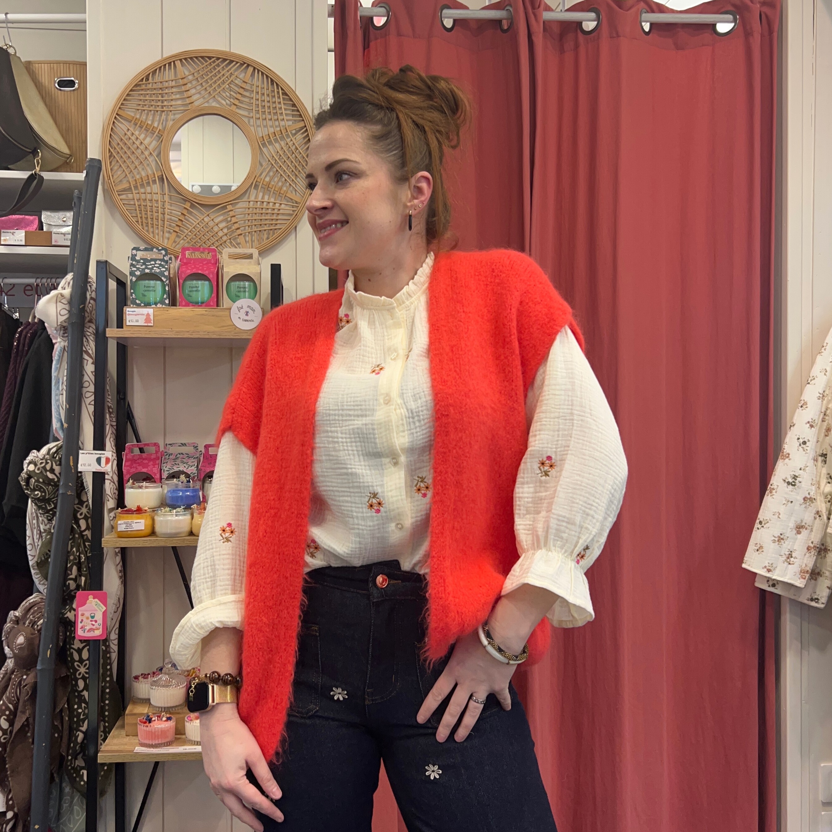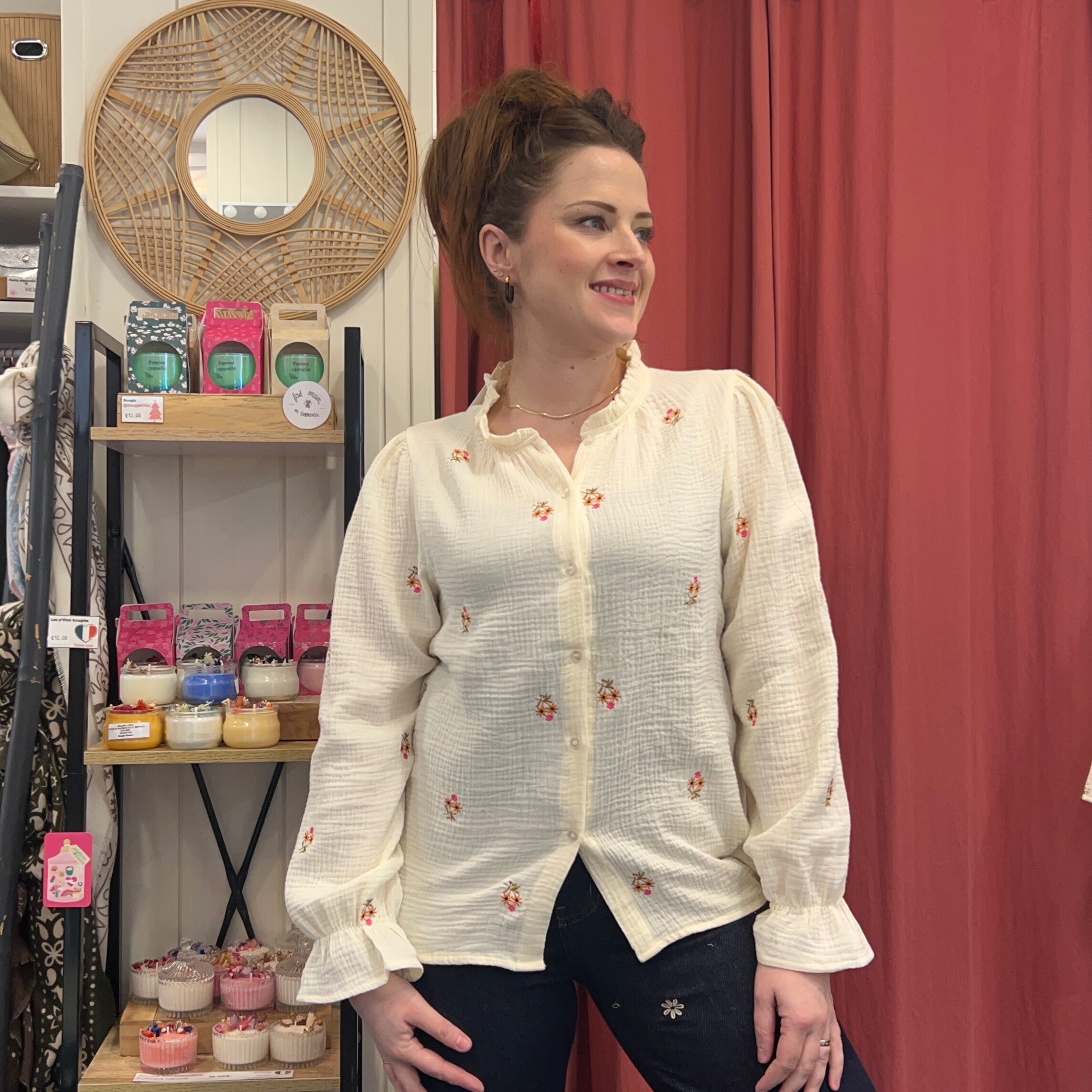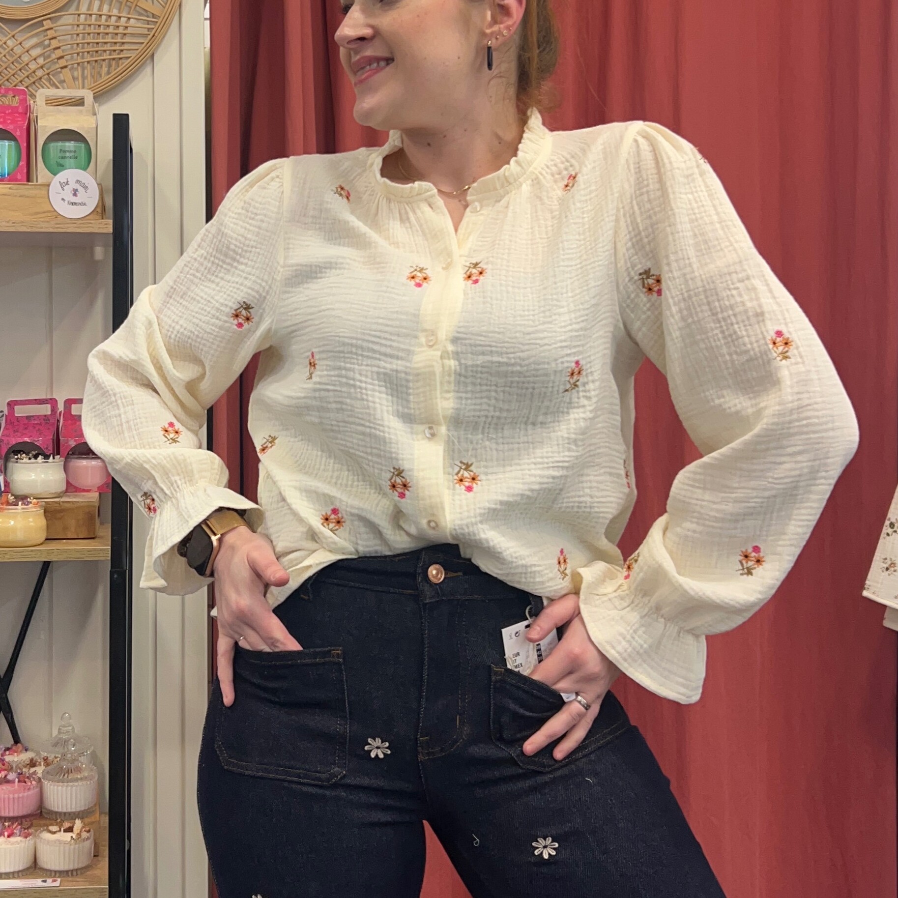 Confectionnée dans une matière légère et agréable à porter, elle se distingue par ses délicates broderies fleuries colorées qui apportent une touche romantique et raffinée. Son col légèrement volanté et ses manches longues avec poignets évasés ajoutent du caractère tout en douceur.