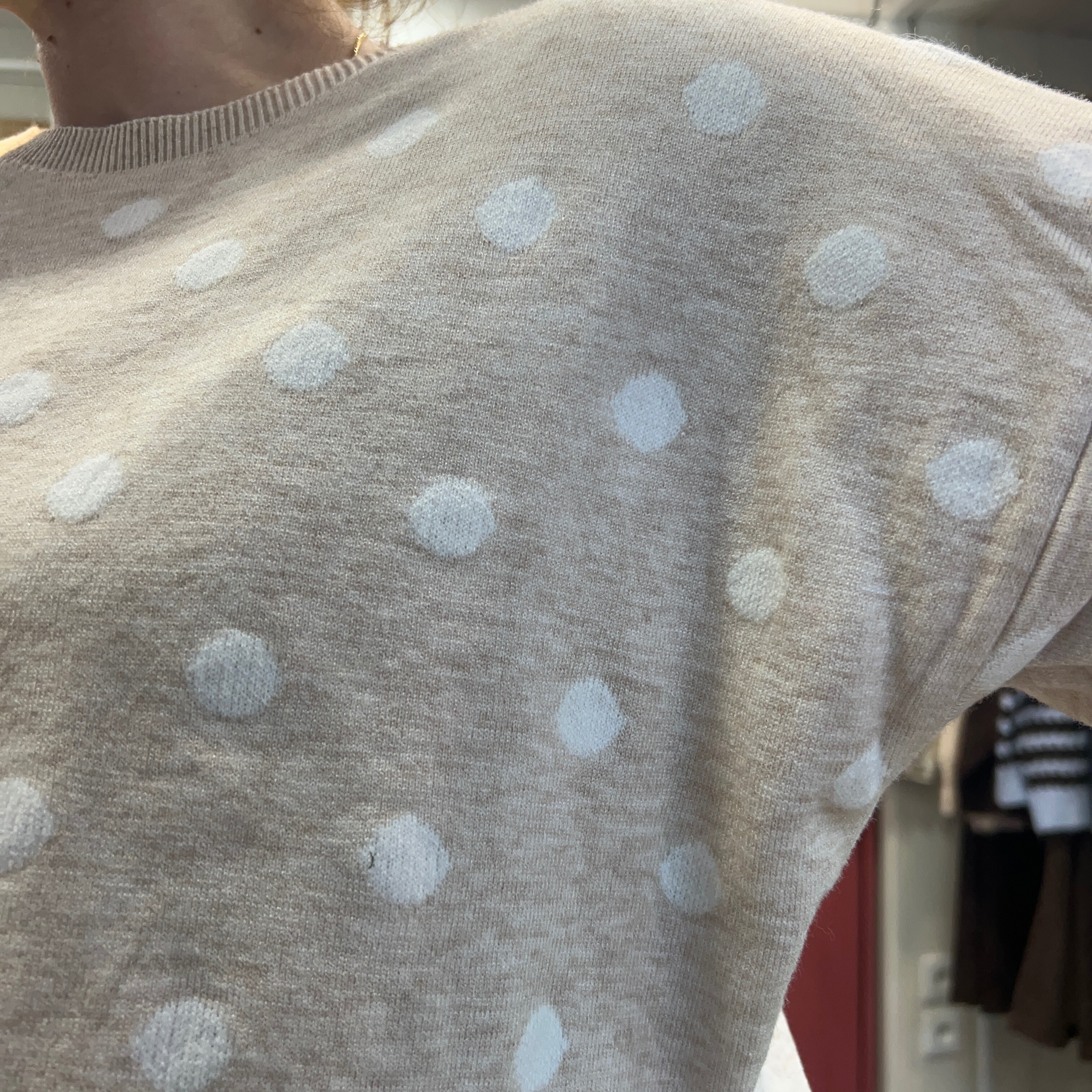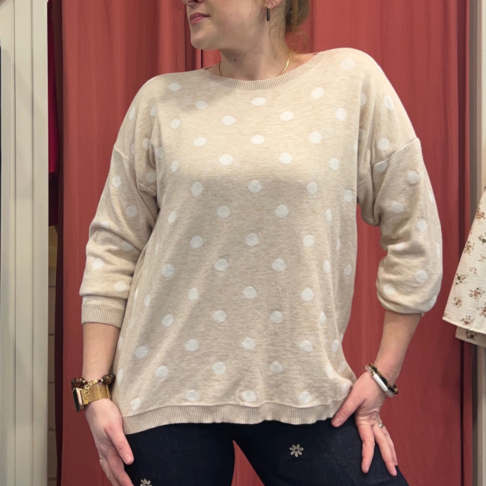 On adore son coloris beige lumineux qui s’associe facilement avec un jean brut, un pantalon fluide ou même une jupe pour un look plus féminin. Les pois discrets ajoutent ce petit détail mode qui fait toute la différence sans en faire trop.