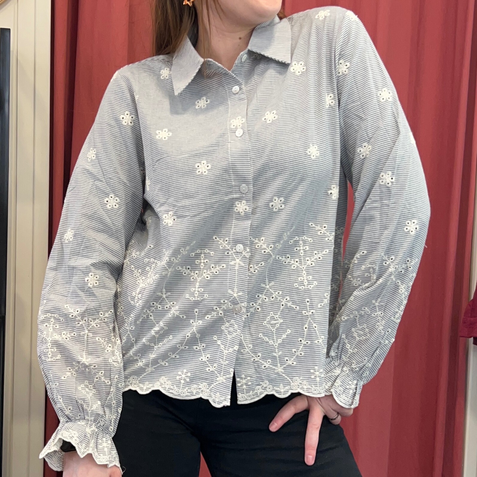 Avec ses fines rayures délicates et ses broderies blanches ajourées, elle apporte une touche romantique et lumineuse à votre tenue. On adore le travail de broderie sur le bas et les manches, ainsi que la finition légèrement festonnée qui donne du caractère à cette chemise féminine et élégante.