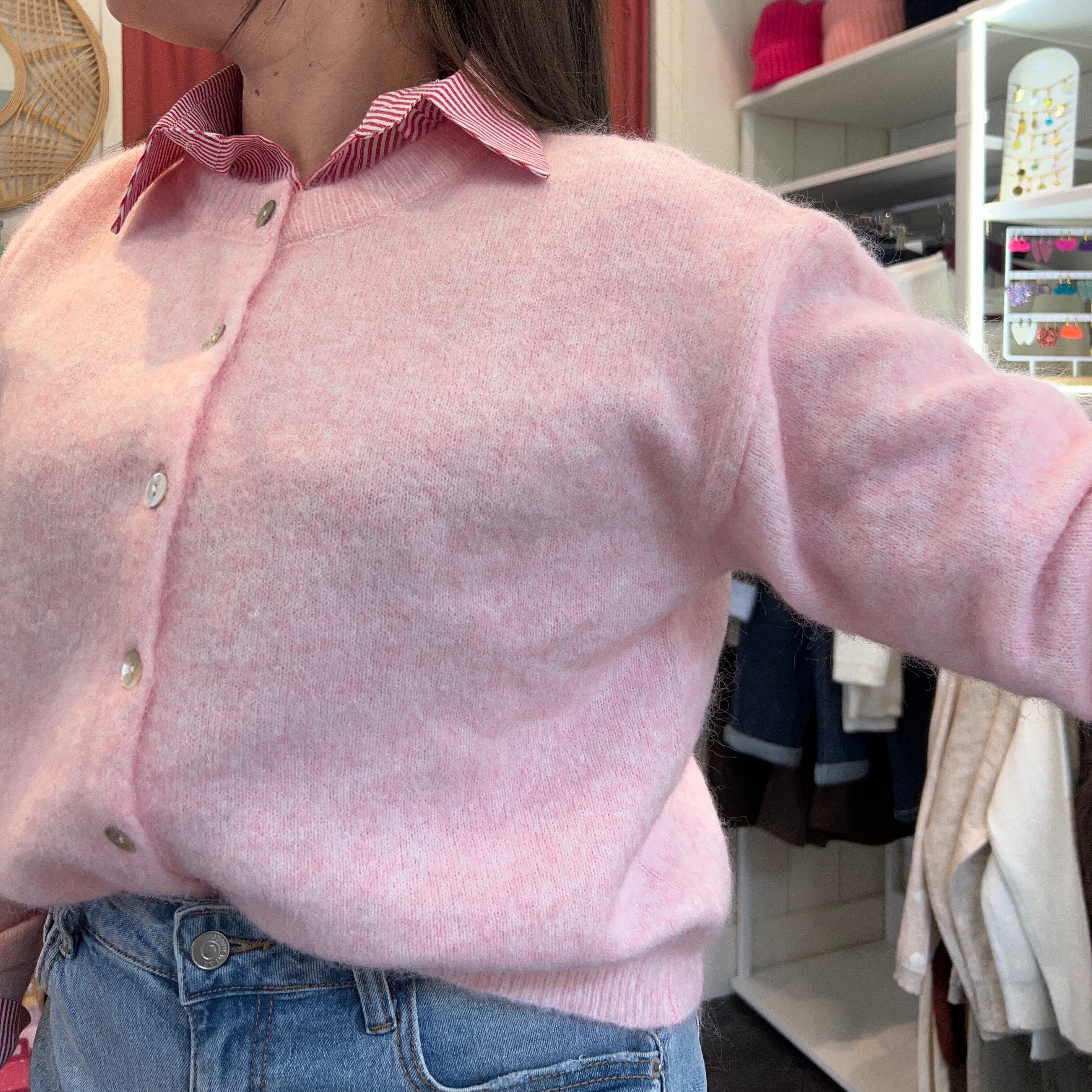 Ce gilet rose pastel apporte immédiatement de la lumière et de la fraîcheur à votre silhouette. Sa teinte douce illumine le teint et se marie parfaitement avec un jean brut, un pantalon clair ou une jupe fluide.