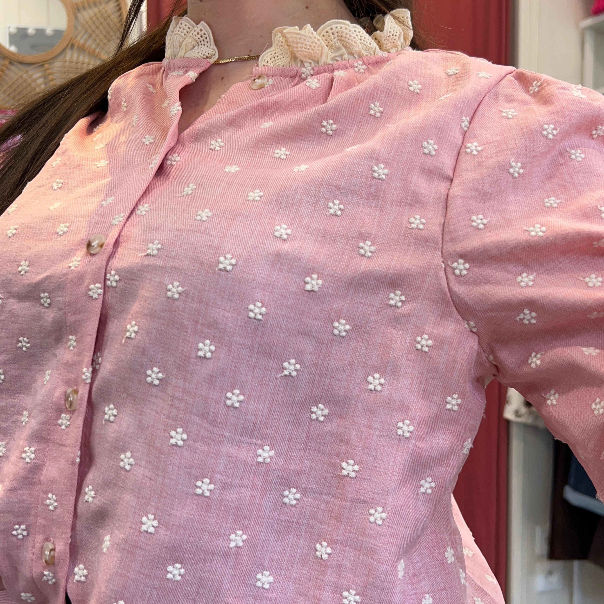 Cette blouse rose délicat, subtilement brodée de petites fleurs blanches, est une véritable pépite féminine. Son tissu légèrement texturé apporte du relief et du charme, tout en restant fluide et agréable à porter.