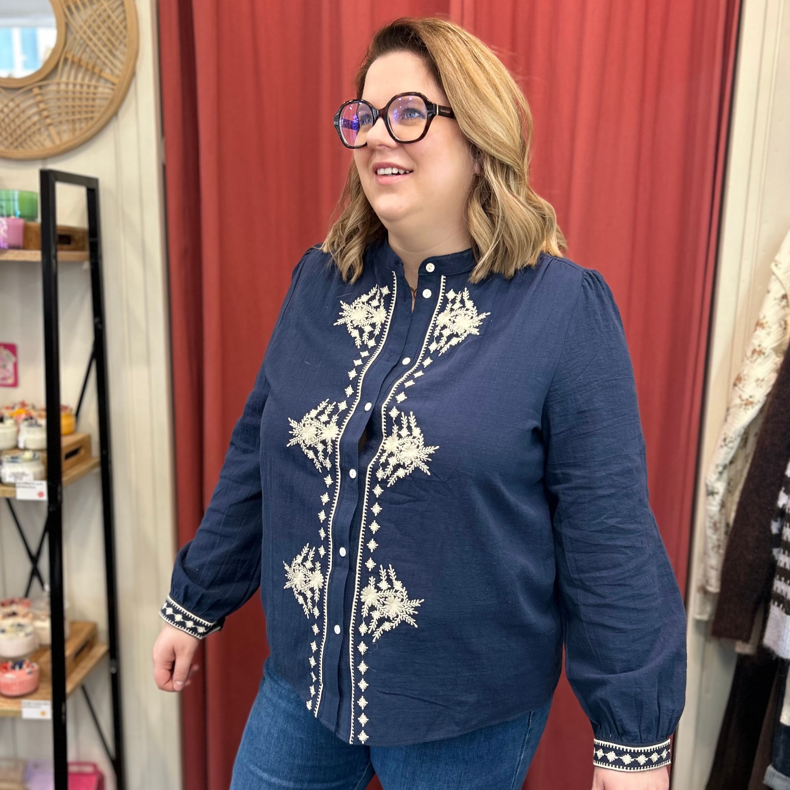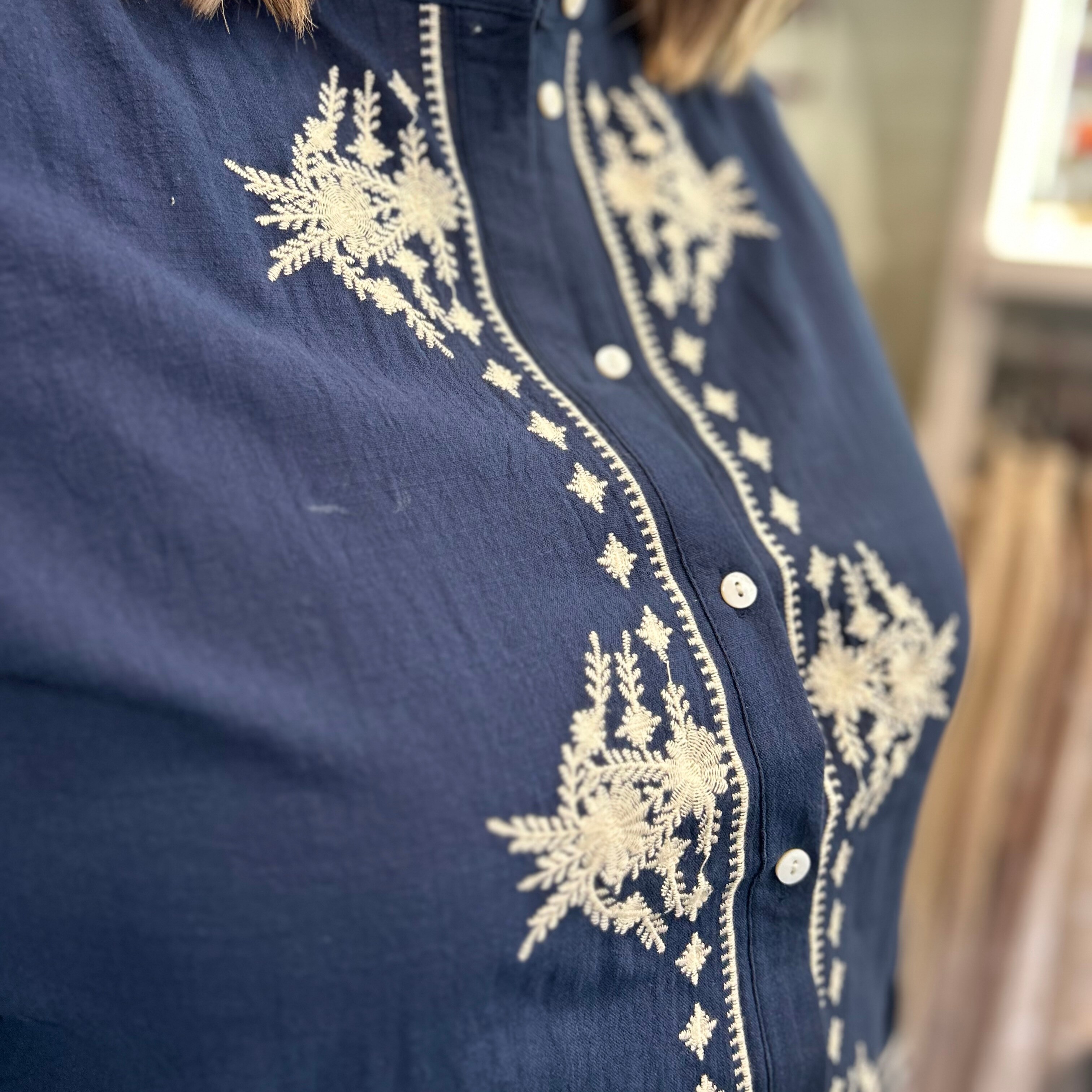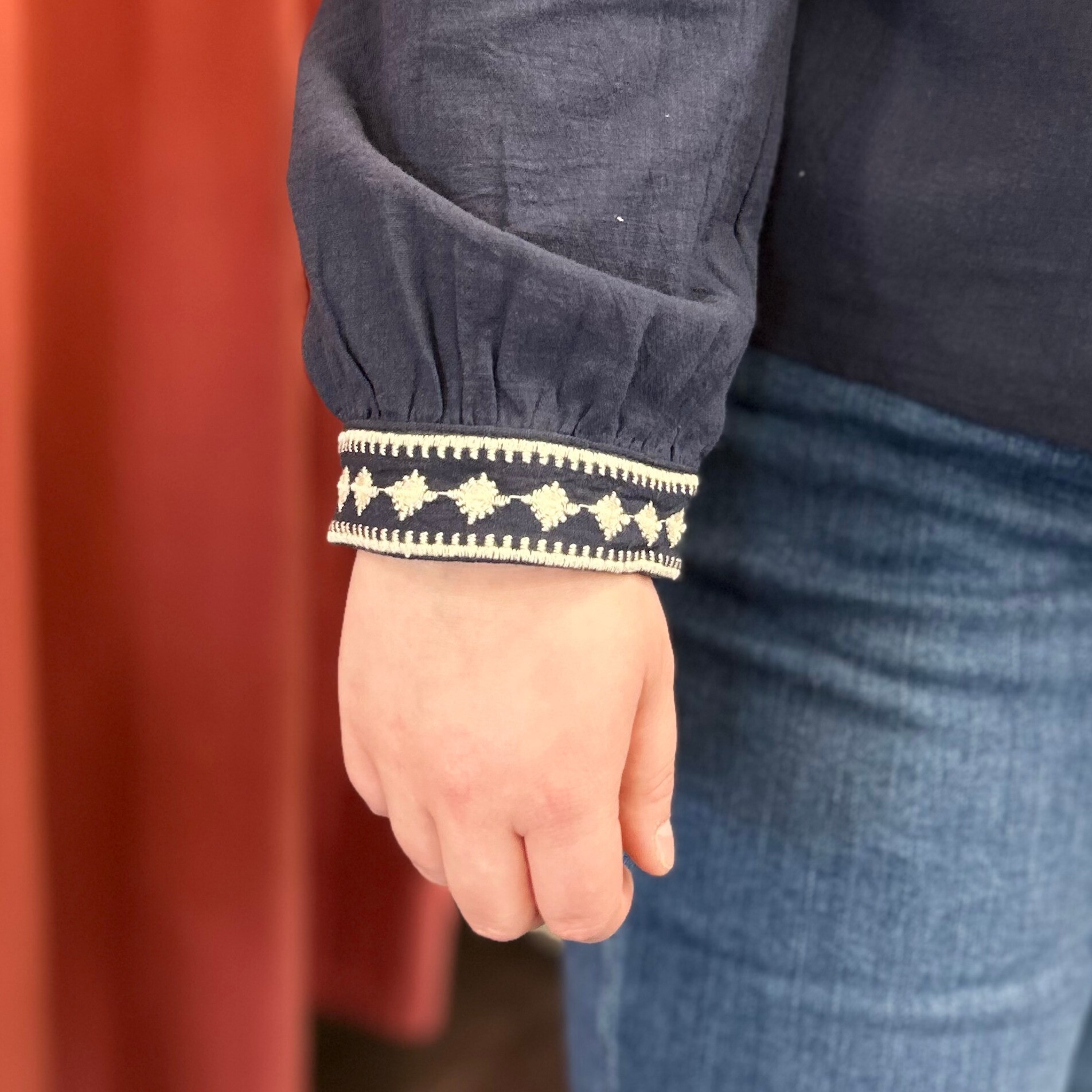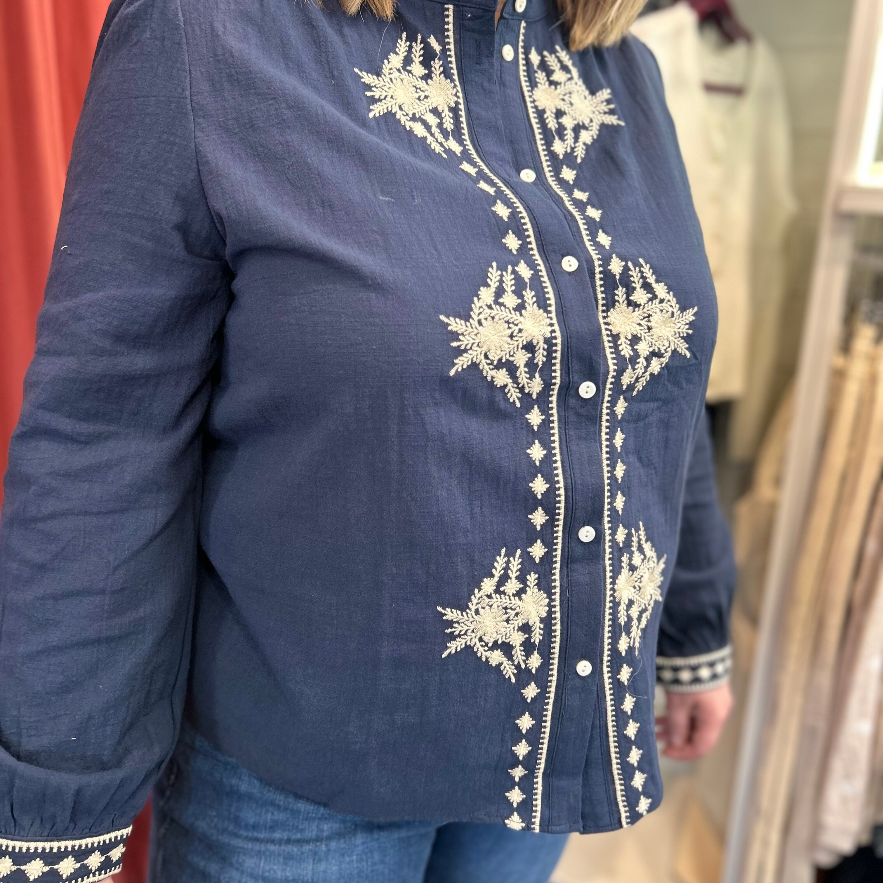 Laissez-vous séduire par cette sublime blouse marine aux broderies écrues délicatement travaillées, une pièce forte qui allie caractère, féminité et confort.
