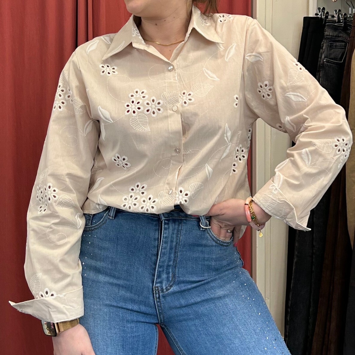 Un chemisier délicat et élégant qui apporte une touche douce et féminine à votre tenue. Sa jolie teinte beige lumineuse est sublimée par de belles broderies florales ajourées, qui lui donnent beaucoup de charme et de légèreté. Facile à porter au quotidien, il s’associe parfaitement avec un jean pour un look casual chic ou avec un pantalon habillé pour une tenue plus élégante.