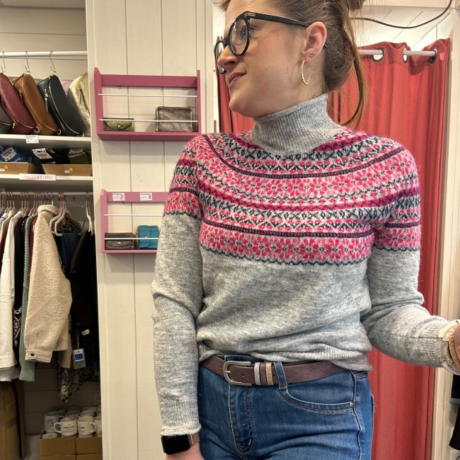 Pull gris et rose col montant