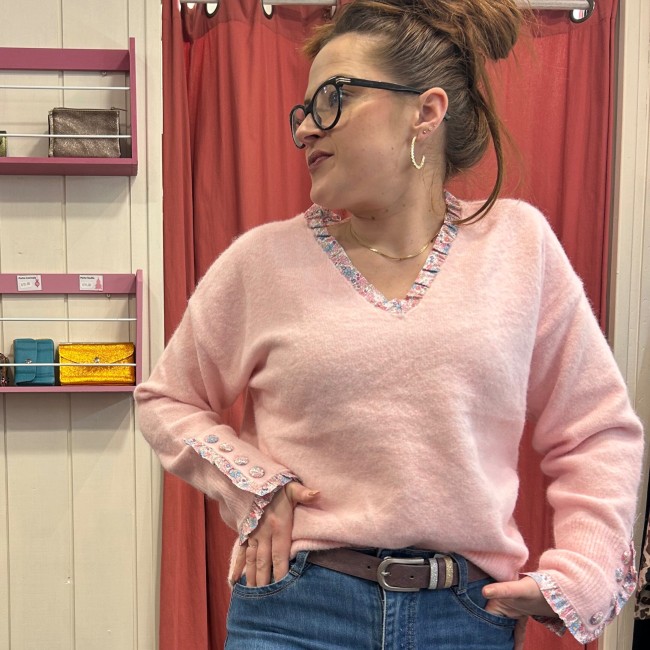 Pull rose col v avec contours liberty