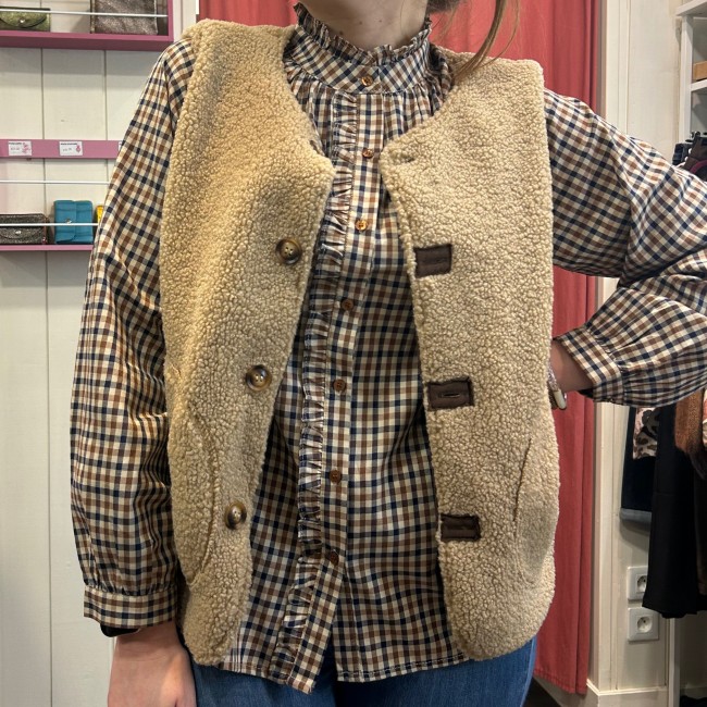 Gilet écru sans manches bouclettes avec plastron décoratif sur la poitrine