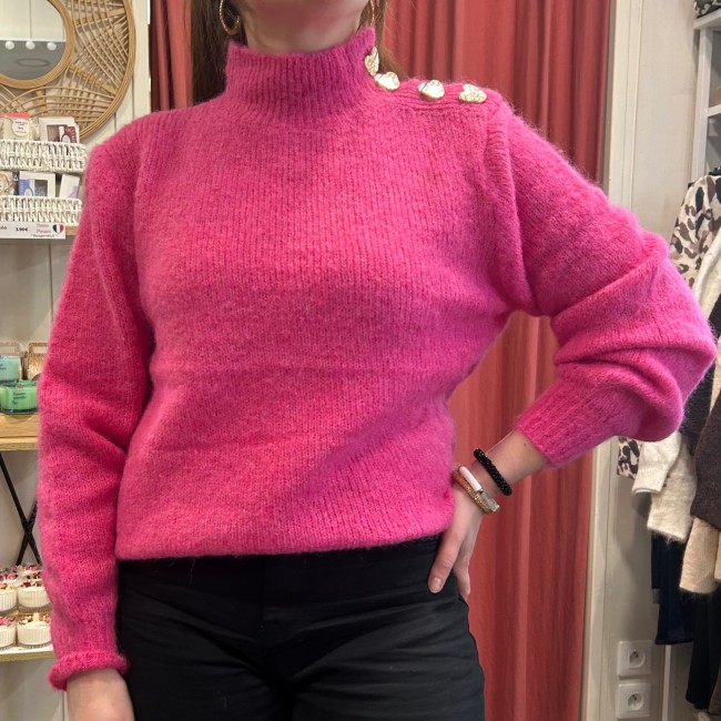 Pull rose col montant avec détails boutons cœurs