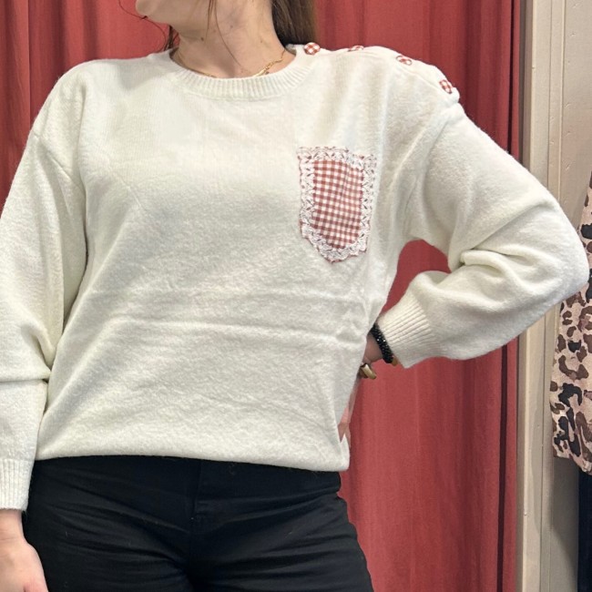 Pull blanc détails rouges en vichy