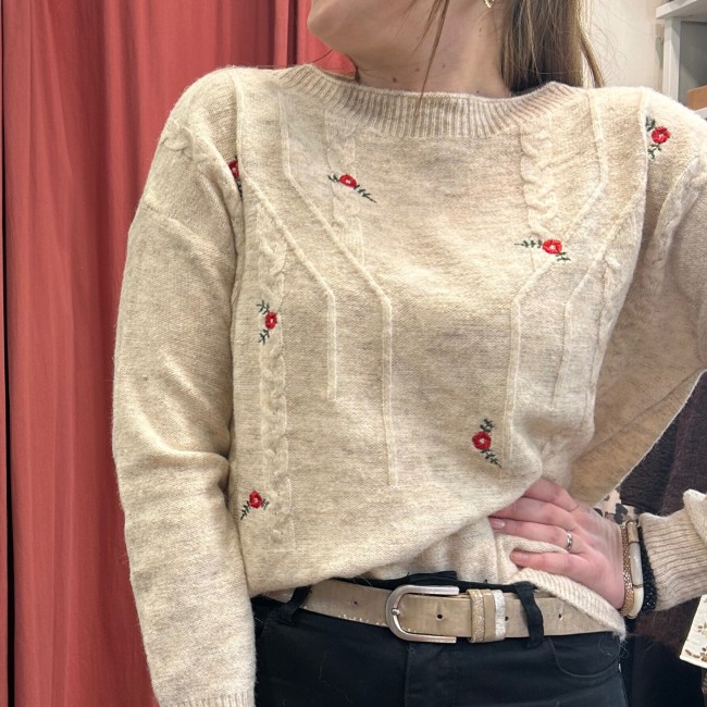 Pull écru brodé fleurs